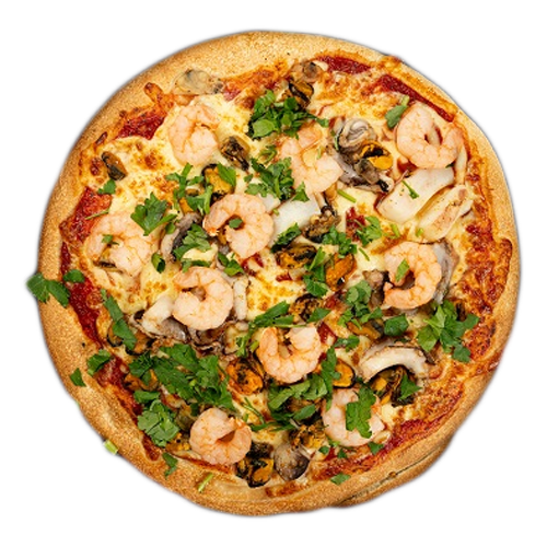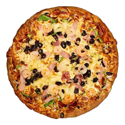 Supremeham, mushroom, onion, salami, capsicum, pineapple, prawns, bacon + olives×