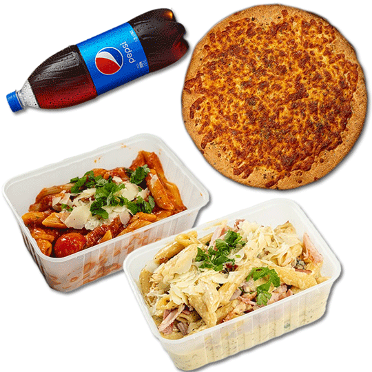Mix N Match$46.901 Large Pizza + 1 Small Garlic Pizza + 1 Fresh Pasta + 1.25L Drink